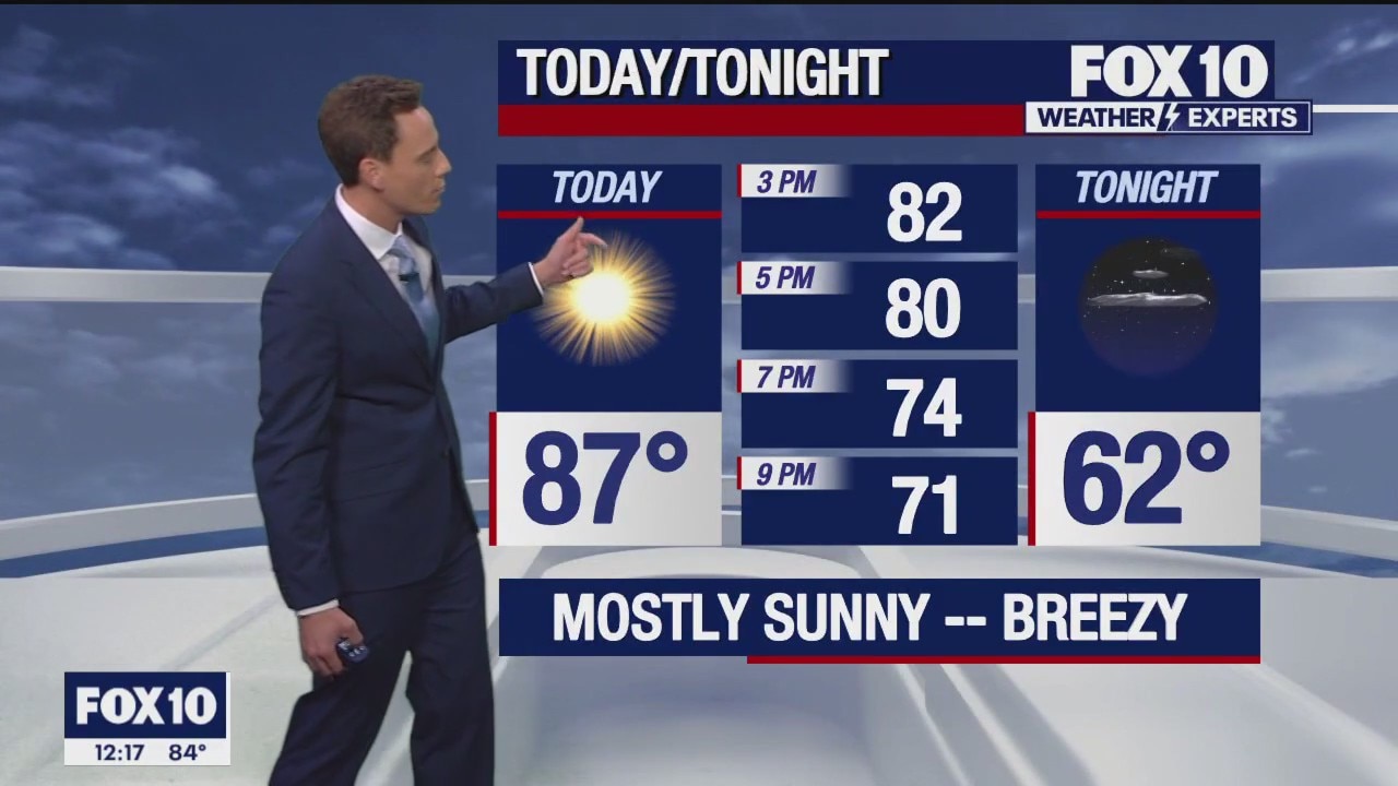 Mostly sunny and breezy today in the Valley with a high in the upper 80s.