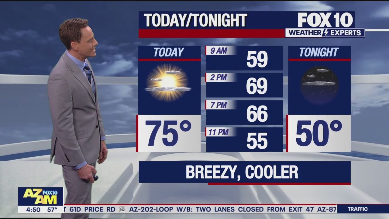 A breezy and cooler day in the Valley with a high near 75?F.