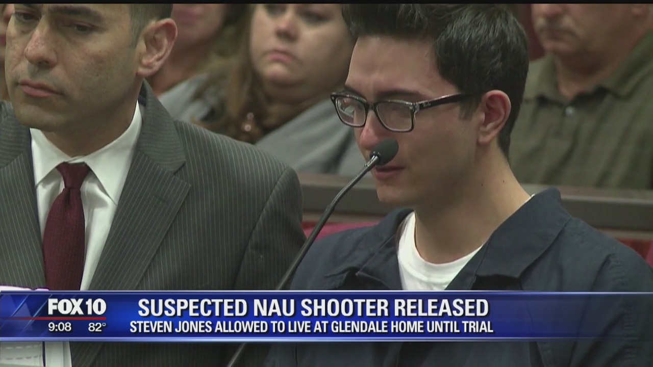 The NAU college student accused of killing one and wounding 3 other fraternity brothers last fall is back home.
