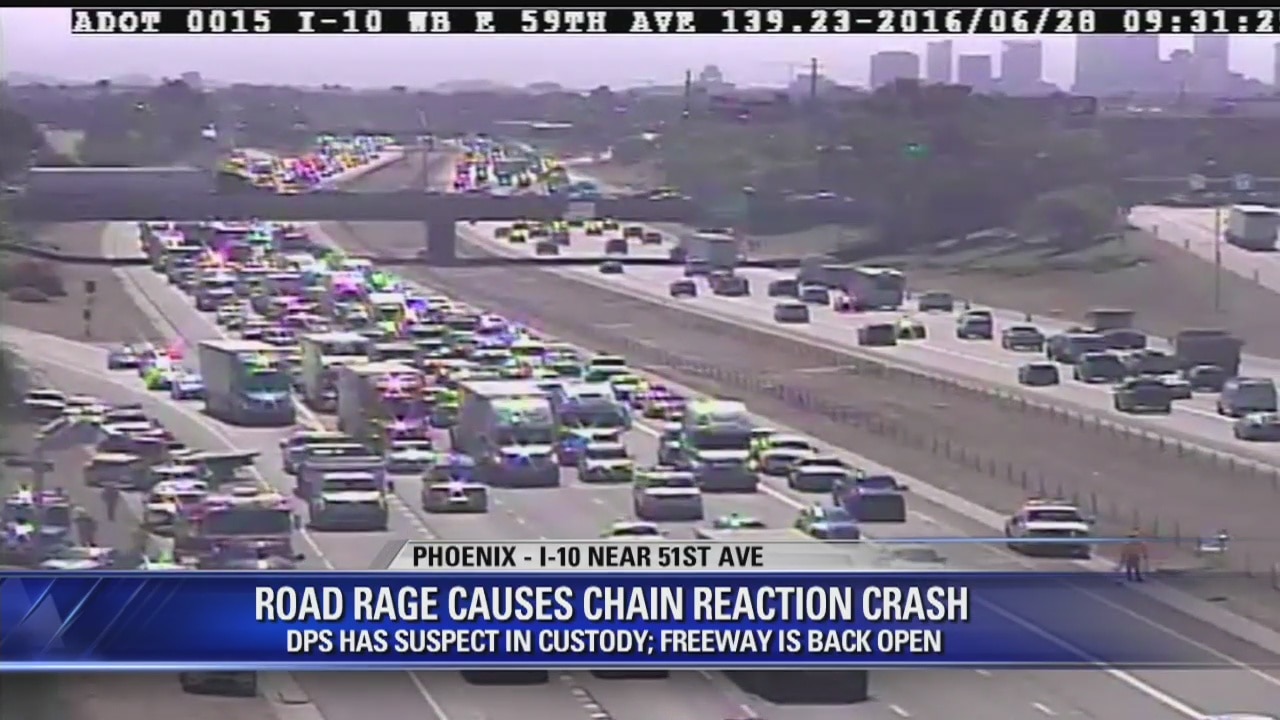 Authorities say road rage led to a suspect chasing another vehicle and causing a chain-reaction crash on a Phoenix freeway.