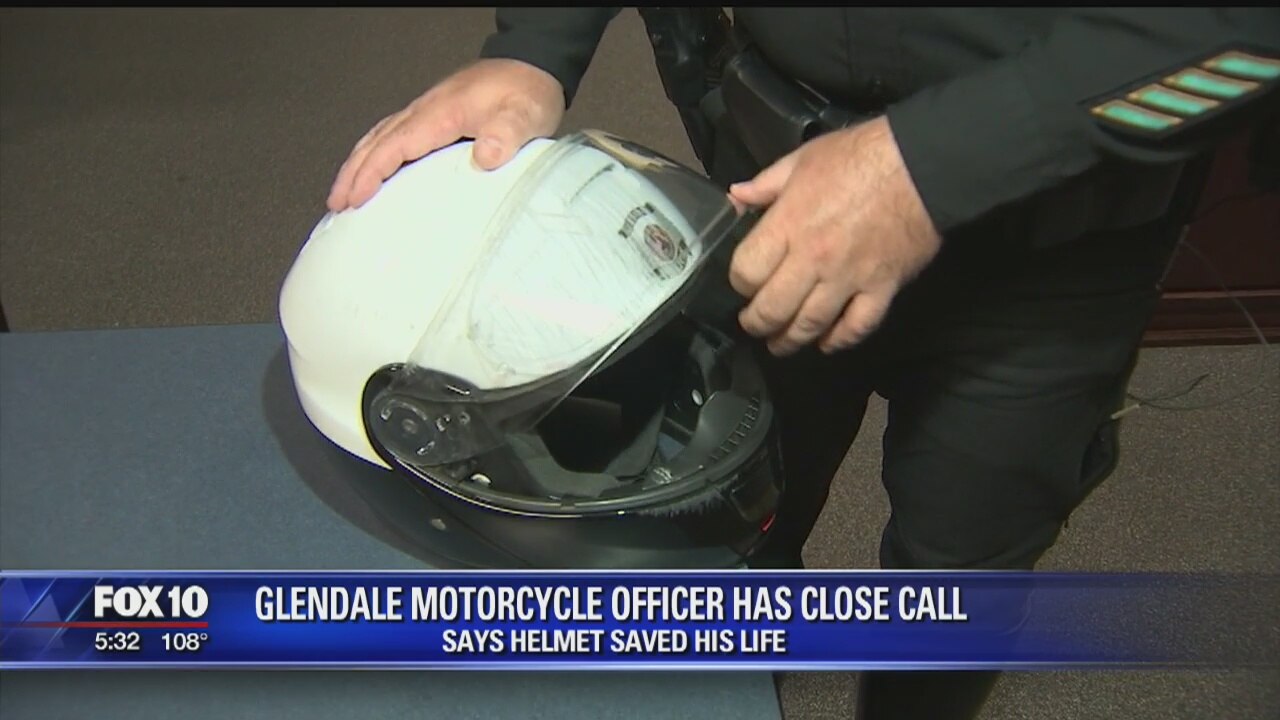 A close call for a Glendale Police motorcycle officer last month could have cost him his life, but he hopes the damage left over will make anyone who rides think twice about not wearing a helmet. FOX 10's Liz Kotalik reports.