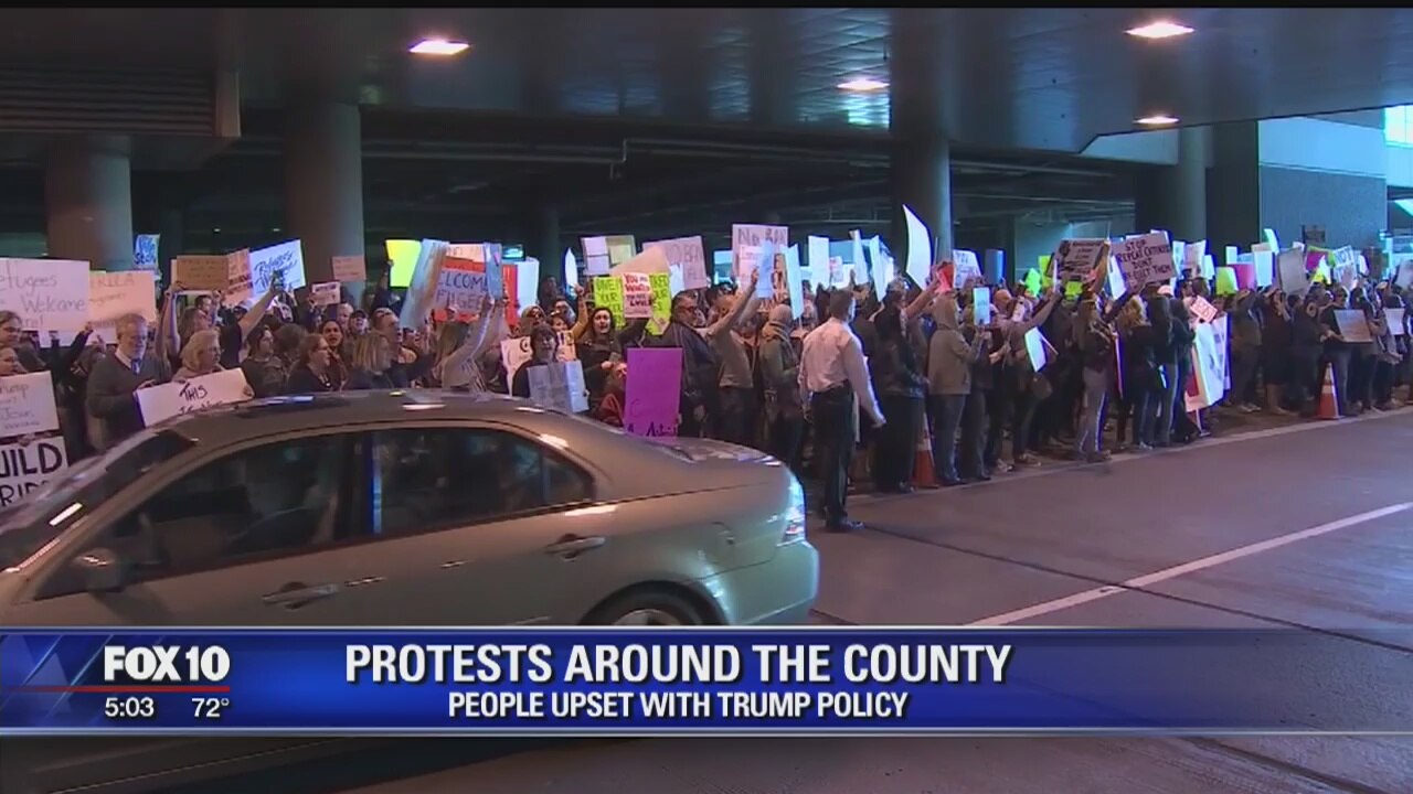 Hundreds of demonstrators came out to Sky Harbor International Airport to protest President Trump's ban on refugees. Fox 10's Marcy Jones reports.
