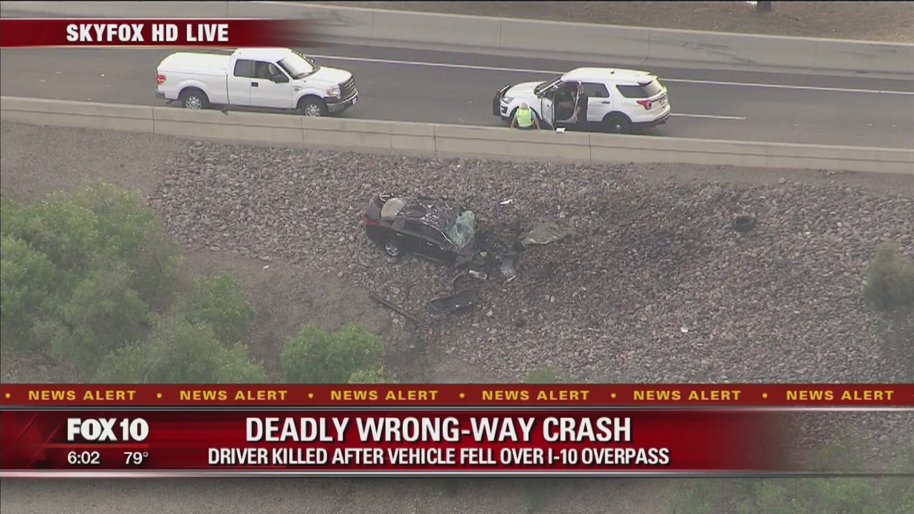 Authorities say a man is dead after a wrong-way car crashed into a commercial truck and fell off a Phoenix freeway.