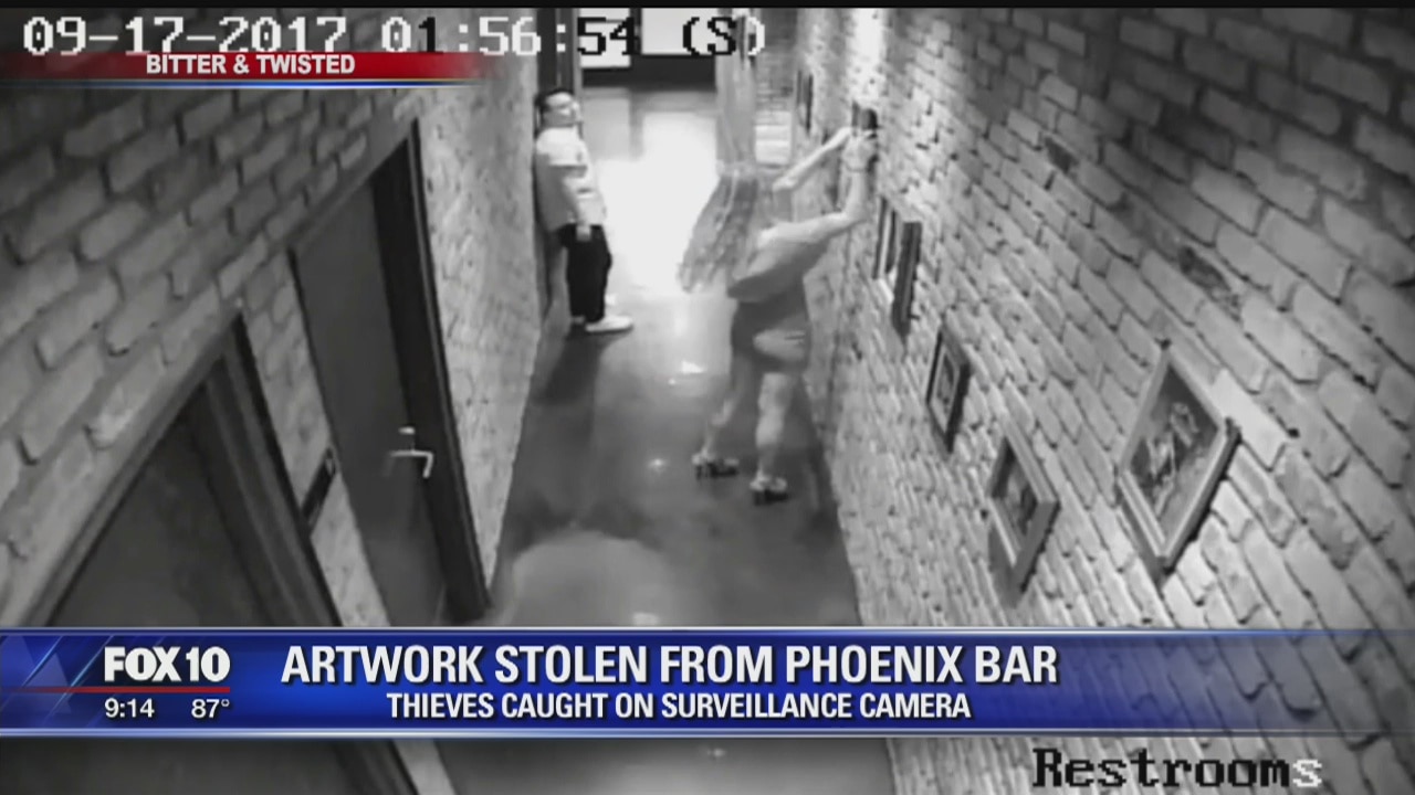 Caught on camera: a pair of brazen thieves in action at a popular bar in Downtown Phoenix. They were seen, on surveillance camera, stealing some artwork from Bitter and Twisted by ripping it right off the wall. FOX 10's Matt Rodewald reports.