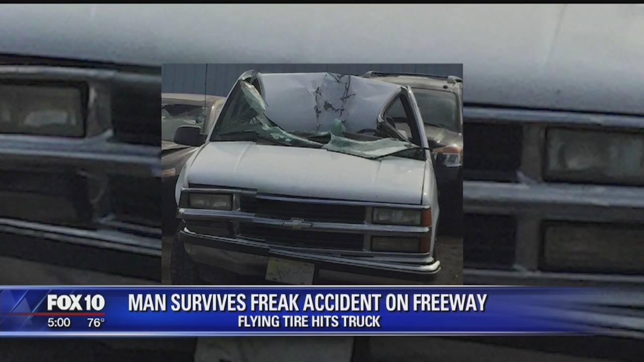 It was an extremely close call for one?valley man,?after a tire came smashing through his windshield along the freeway.The man, who is lucky to be alive, is out of the hospital. FOX 10's Danielle Miller reports.