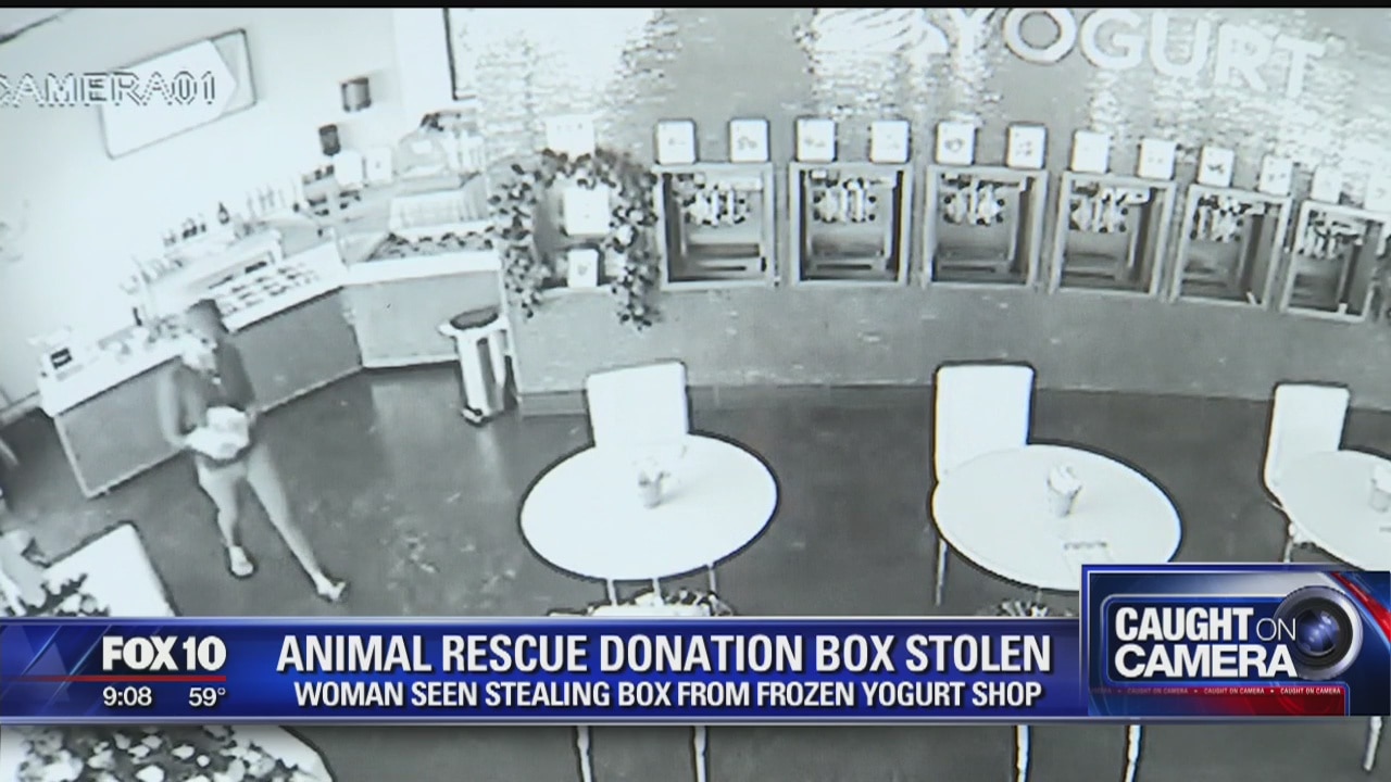 Caught on camera: a despicable crime. A woman was seen on surveillance video stealing a donation box from the Yummee�Yogurt shop near Loop 101 and 83rd Avenue.�FOX 10's Matt Rodewald reports.