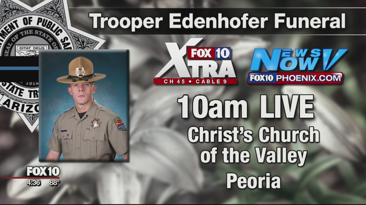 PEORIA, Ariz. (AP) - A funeral is set for a rookie Arizona state trooper fatally shot by a suspect who took another officer's weapon during a confrontation on an interstate. Friends and loved ones will bid farewell to 24-year-old Tyler Edenhofer on Friday at a Peoria church. Edenhofer was one of several officers who responded July 25 to reports of a person throwing objects at cars on Interstate 10 in suburban Phoenix.