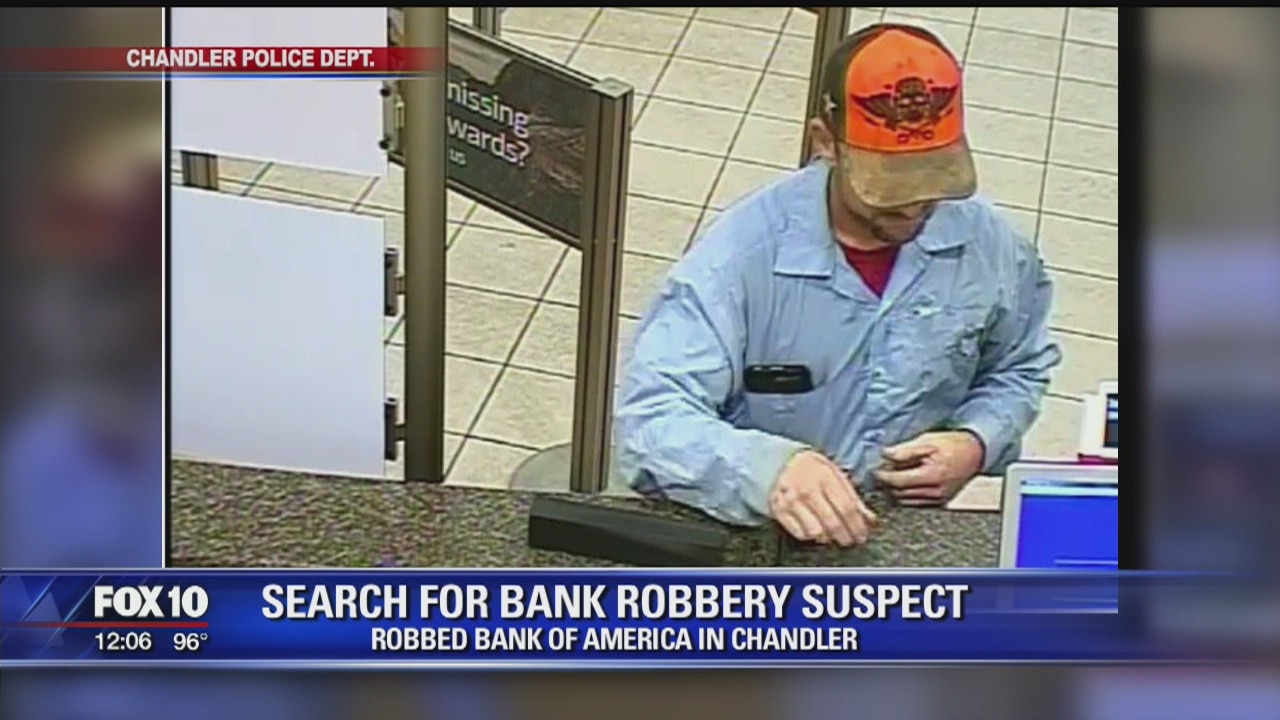 CHANDLER, Ariz. (KSAZ) - Police say a man is on the run after robbing a Bank of America in Chandler on Tuesday. According to Sgt. Daniel Mejia with Chandler police, the suspect entered the Bank of America located near the Loop 101 and Chandler Boulevard at 1:44 p.m., handed a note to the bank teller and was given an undisclosed amount of money.