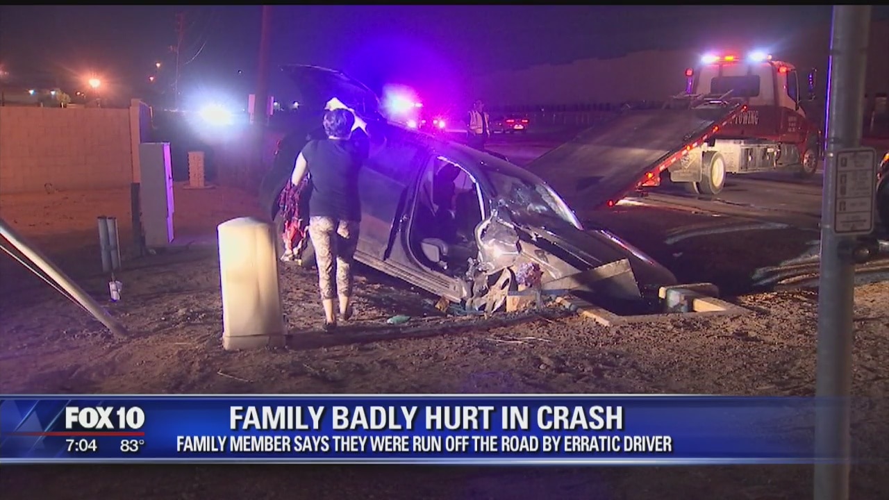 TOLLESON, Ariz. (KSAZ) - Six people, including four children, are in critical condition after police say their vehicle was run off the road and landed in a ditch. Police say the vehicle was run off the road by an erratic driver near 32nd?Avenue and Buckeye on Sunday night.