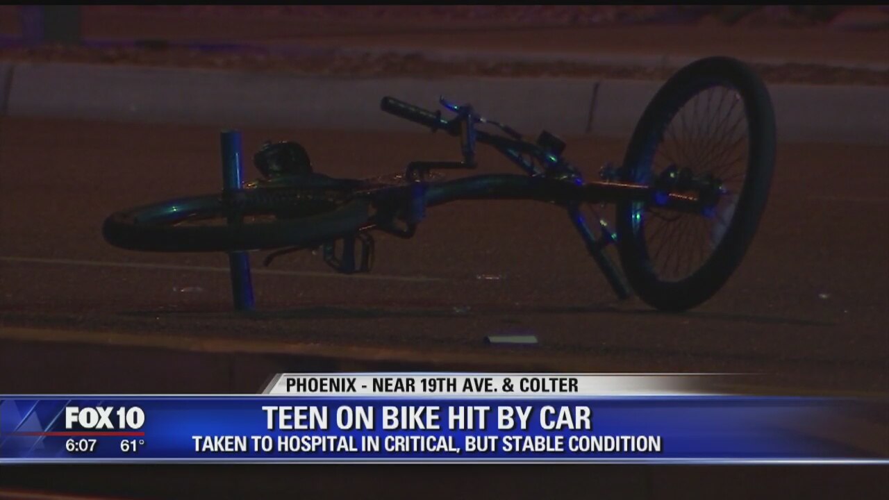 PHOENIX (KSAZ) - A 15-year-old boy is in critical, but stable condition this morning after he was hit by a car on Monday night while riding a bicycle. According to Phoenix police, the boy was hit by the car while riding his bicycle near 19th Avenue and Colter when he didn't stop for a red light.