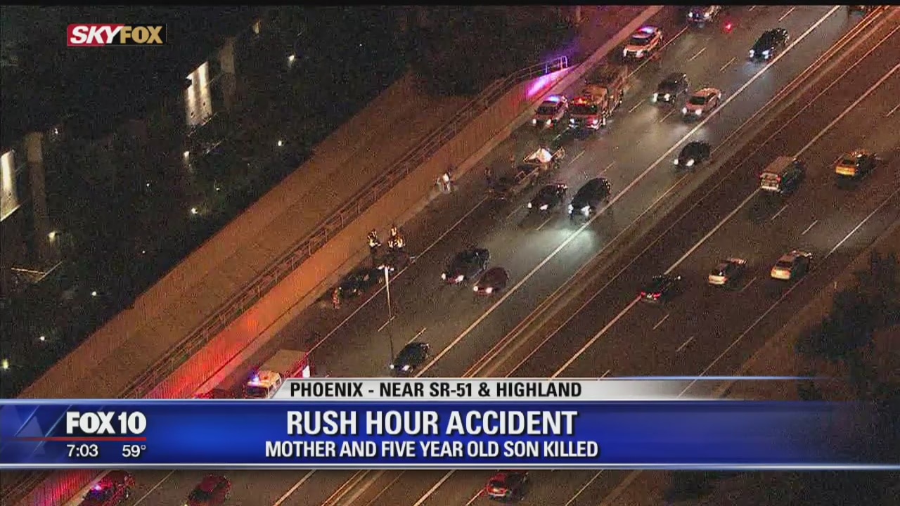 PHOENIX (FOX 10) -�Authorities say two people are dead, including a 5-year-old boy, following a four-car crash along a Phoenix freeway on Monday night. According to Trooper Kameron Lee with the Arizona Department of Public Safety, the crash happened on southbound State Route 51 at 5:52 p.m. when a gray 2003 Chevrolet pickup truck driven by 34-year-old Edgar Ramos-Esteban rear-ended a blue 2005 Kia sedan.