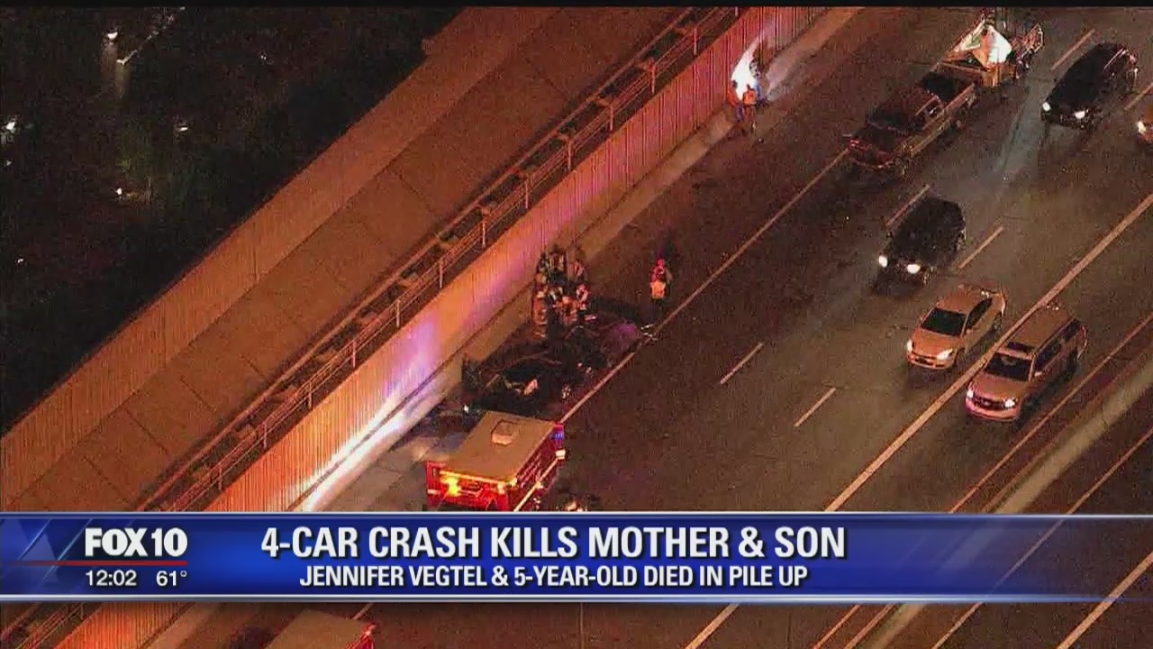 PHOENIX (FOX 10) -�Authorities say a mother and her 5-year-old son where killed in a chain-reaction crash along a Phoenix freeway on Monday night. According to Trooper Kameron Lee with the Arizona Department of Public Safety, the crash happened on southbound State Route 51 near Highland at 5:52 p.m., when a gray 2003 Chevrolet pickup truck driven by 34-year-old Edgar Ramos-Esteban rear-ended a blue 2005 Kia sedan.