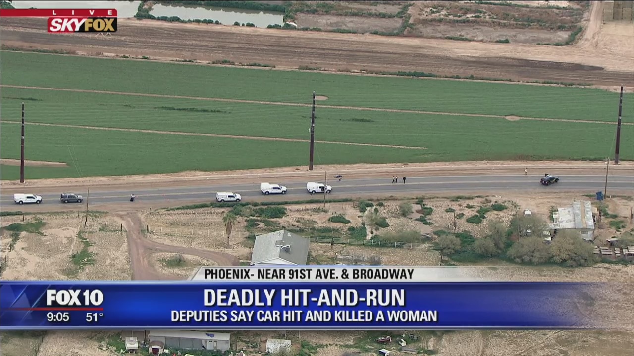 TOLLESON, Ariz. (FOX 10) - Authorities say a homeless woman was killed by a hit-and-run driver while she was walking a dog on Friday morning. According to the Maricopa County Sheriff's Office, the woman and was walking the dog with a homeless man near 91st?Avenue and Broadway when she was hit by a dark-colored vehicle.