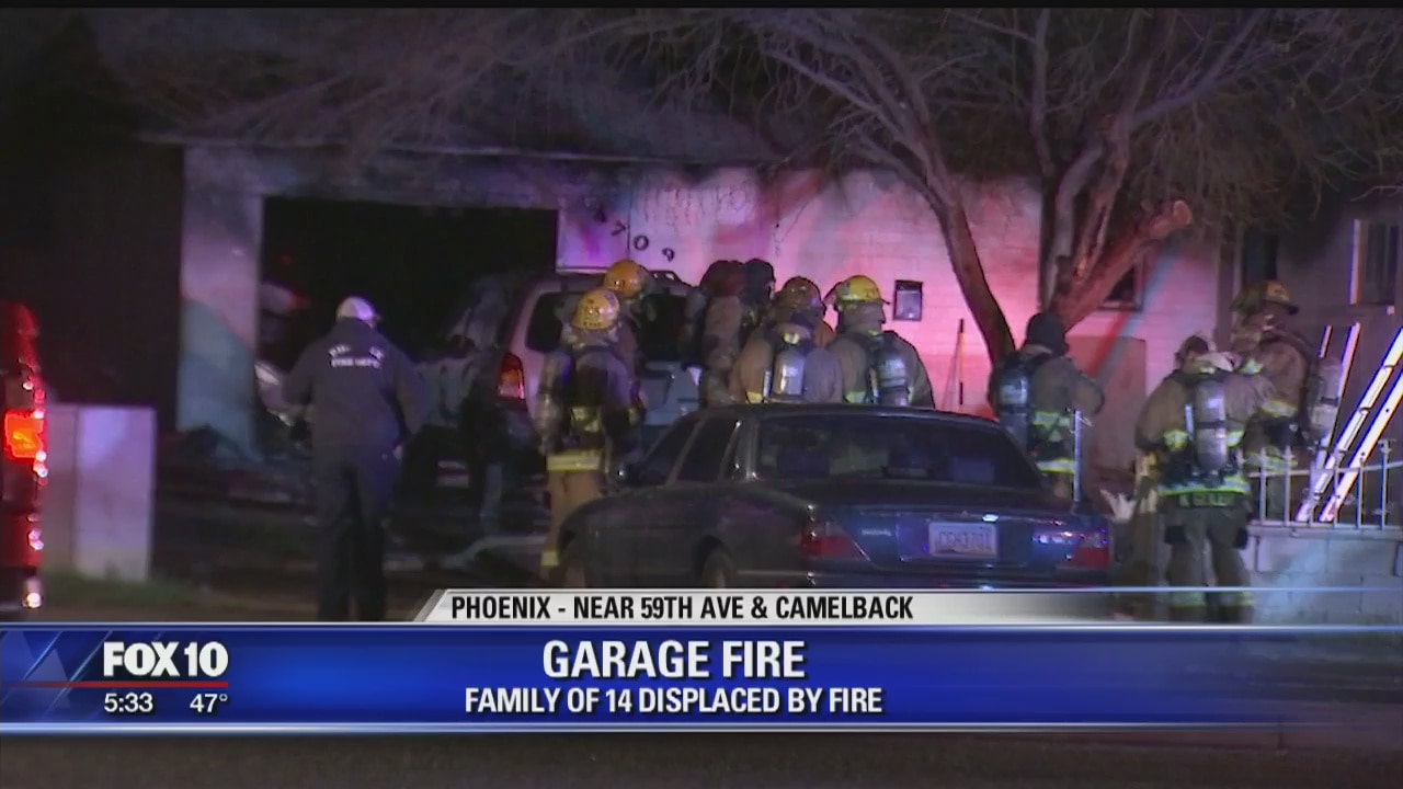 PHOENIX (FOX 10) - A family of 14 is out of their home following a house fire in west Phoenix. According to the Phoenix Fire Department, the fire broke out inside a garage at a home near 59th Avenue and Camelback.