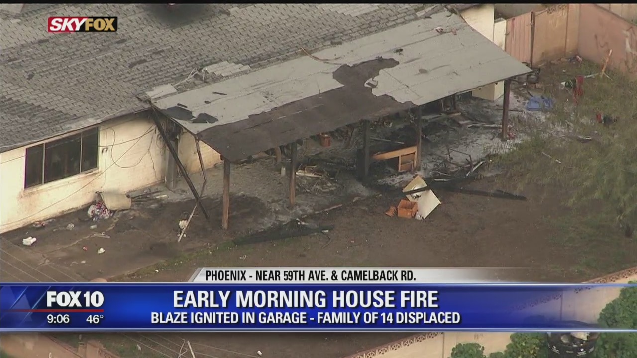 PHOENIX (FOX 10) - A family of 14 is out of their home following a house fire in west Phoenix. According to the Phoenix Fire Department, the fire broke out inside a garage at a home near 59th Avenue and Camelback.