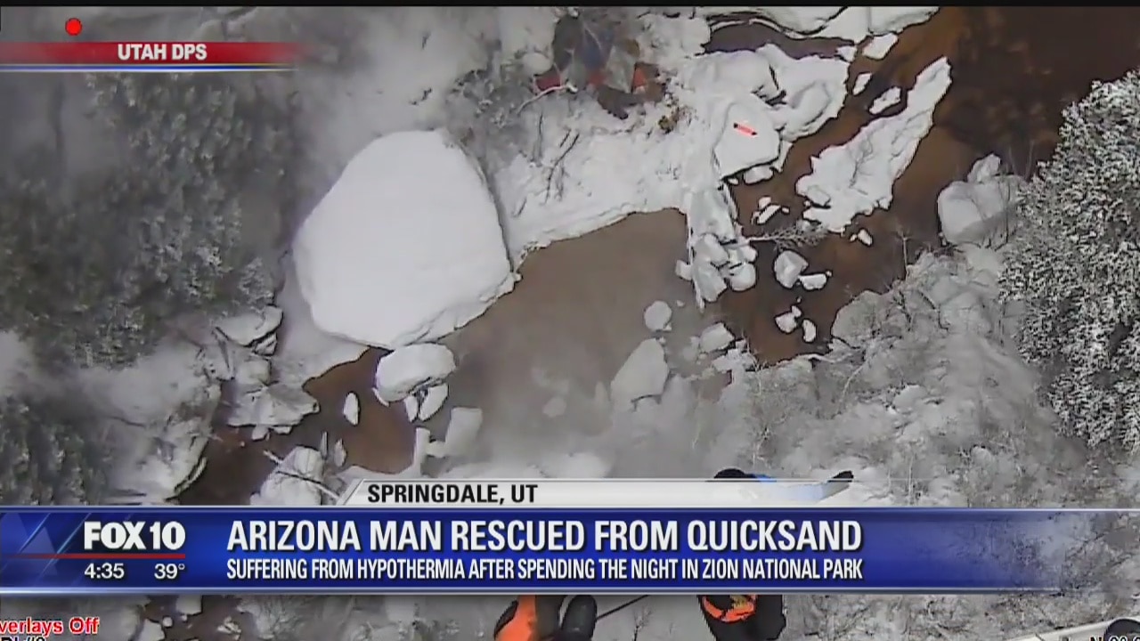 SPRINGDALE, Utah (AP/FOX 10) - Authorities have rescued a hiker who got stranded in a creek during winter weather at Zion National Park in Utah after his leg got stuck in quicksand. Zion National Park says the 34-year-old man from Arizona and his companion were unable to free him after his leg got buried knee-deep in quicksand on Saturday afternoon.
