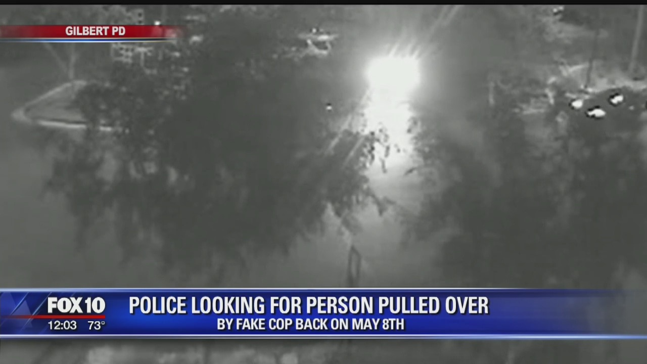 GILBERT, Ariz. (FOX 10) - Gilbert police are looking for someone who they say was pulled over by a person pretending to be a police officer. Video released by the Gilbert Police Department shows a vehicle being stopped by the police impersonator on May 8 near Power and Ray Roads.