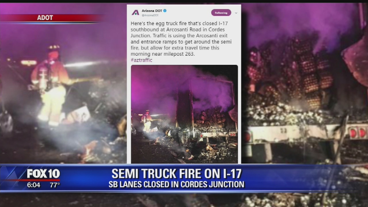 Southbound lanes on the I-17 in northern Arizona at Acrosanti Road are closed due to a semi-truck hauling eggs catching on fire.