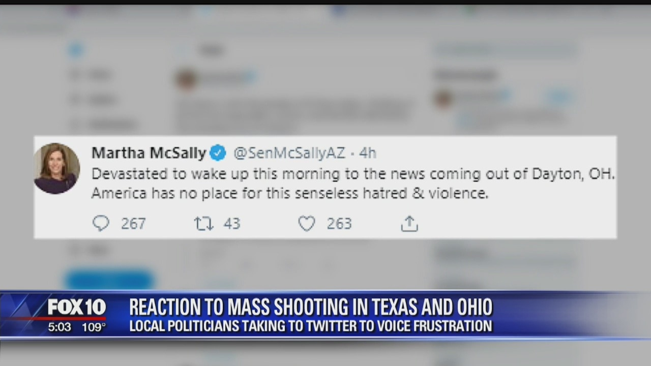 As we continue to learn more about the mass shootings in El Paso, Texas, and Dayton, Ohio, we're checking in with reaction from our local readers. Local politicians are taking to Twitter to express their frustration over the two mass shootings we've seen within 24-hours.
