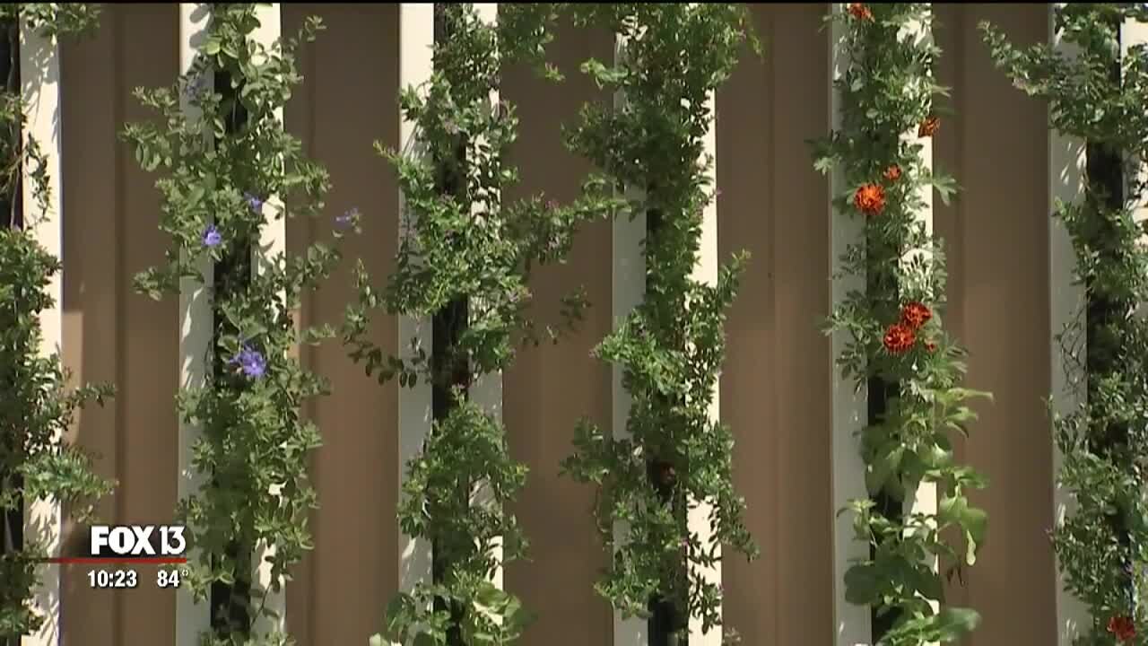 Flowers are blooming in an unconventional spot. It's a vertical hydroponic wall attached to a small generator.