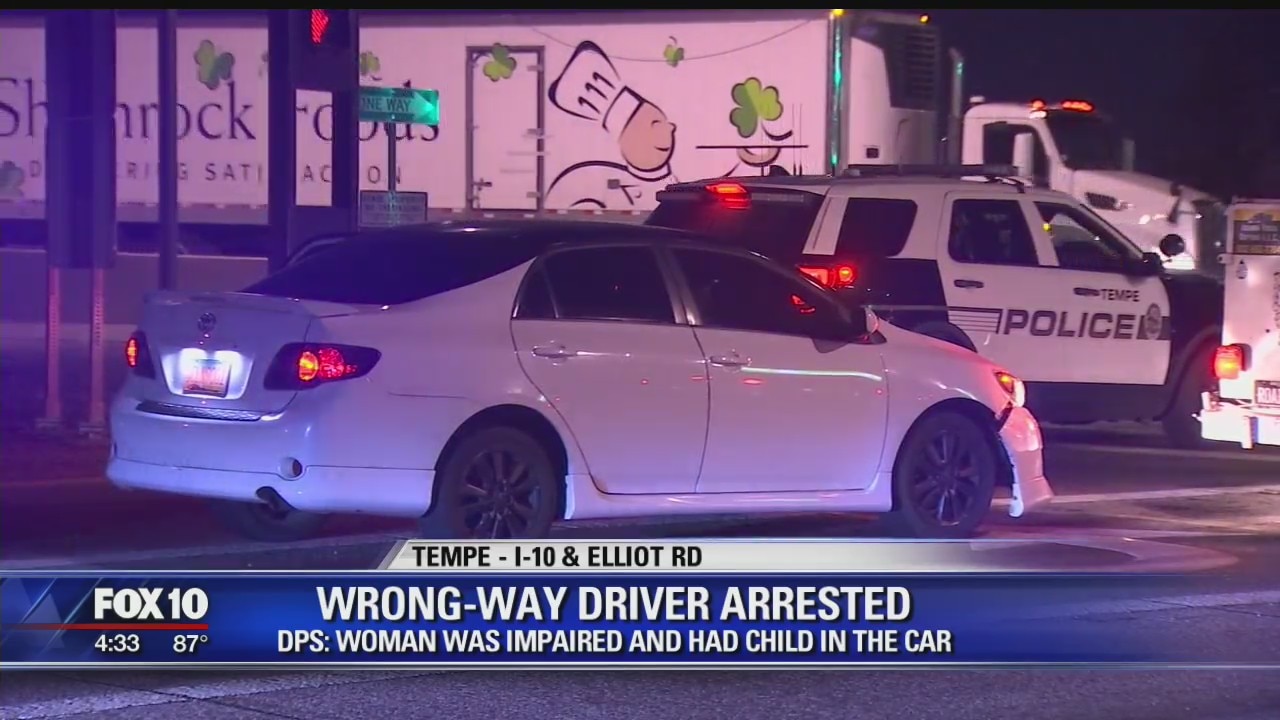 A wrong-way driver was arrested overnight in Tempe and authorities say she was driving impaired with a young child in the car.