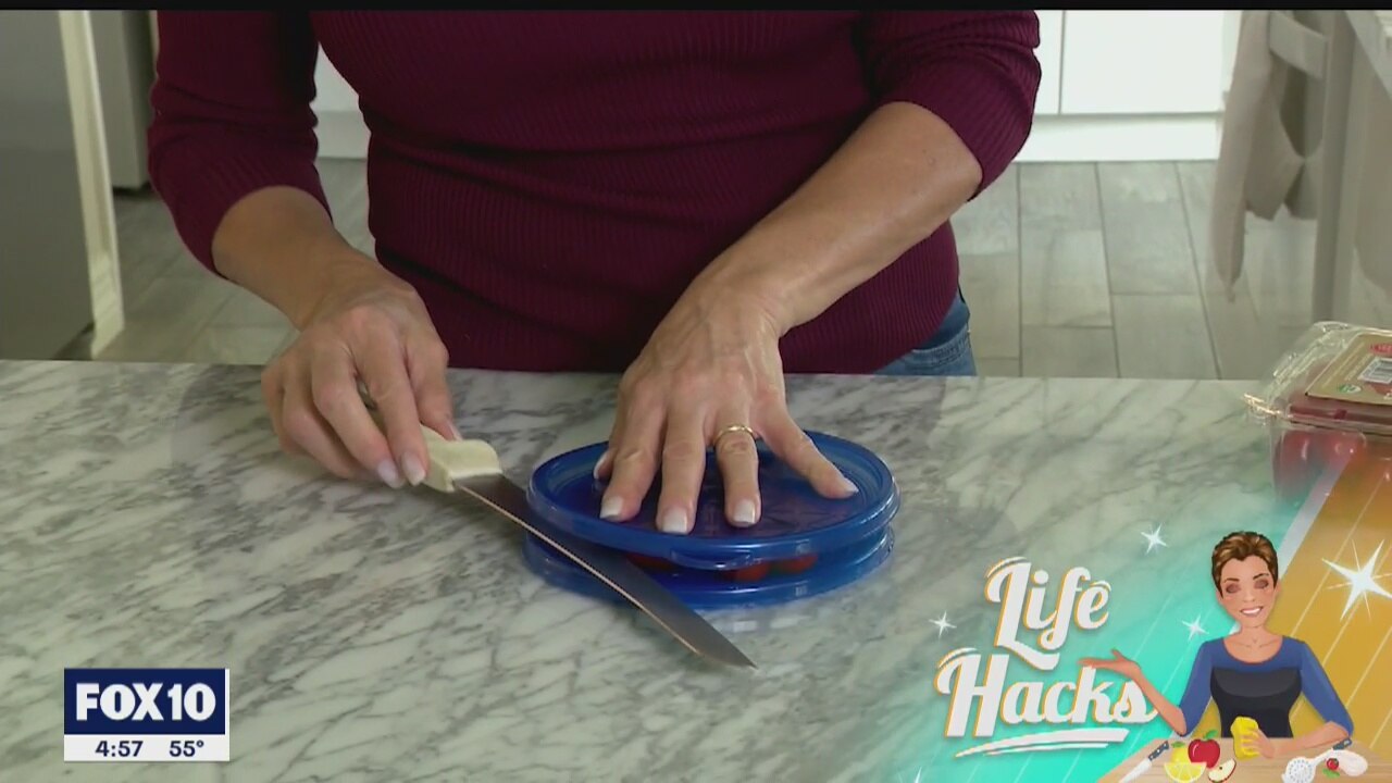 In this episode of Life Hacks, FOX 10's Kari Lake shows us how to halve cherry tomatoes in half the time using container lids.