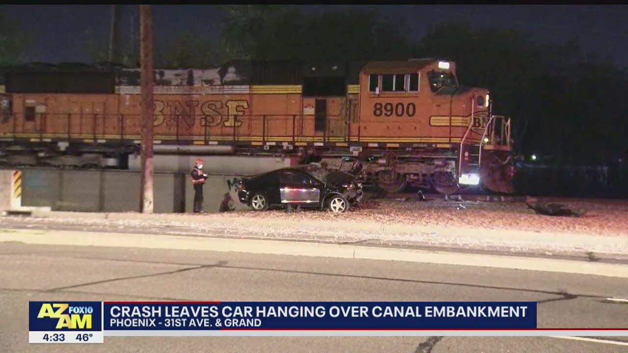 Crash leaves car hanging over canal embankment