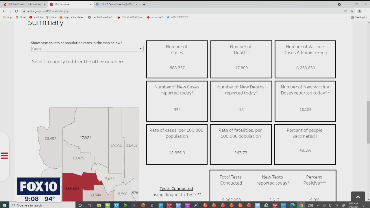 Arizona on June 17 reported 332 additional confirmed COVID-19 cases and 18 new deaths.