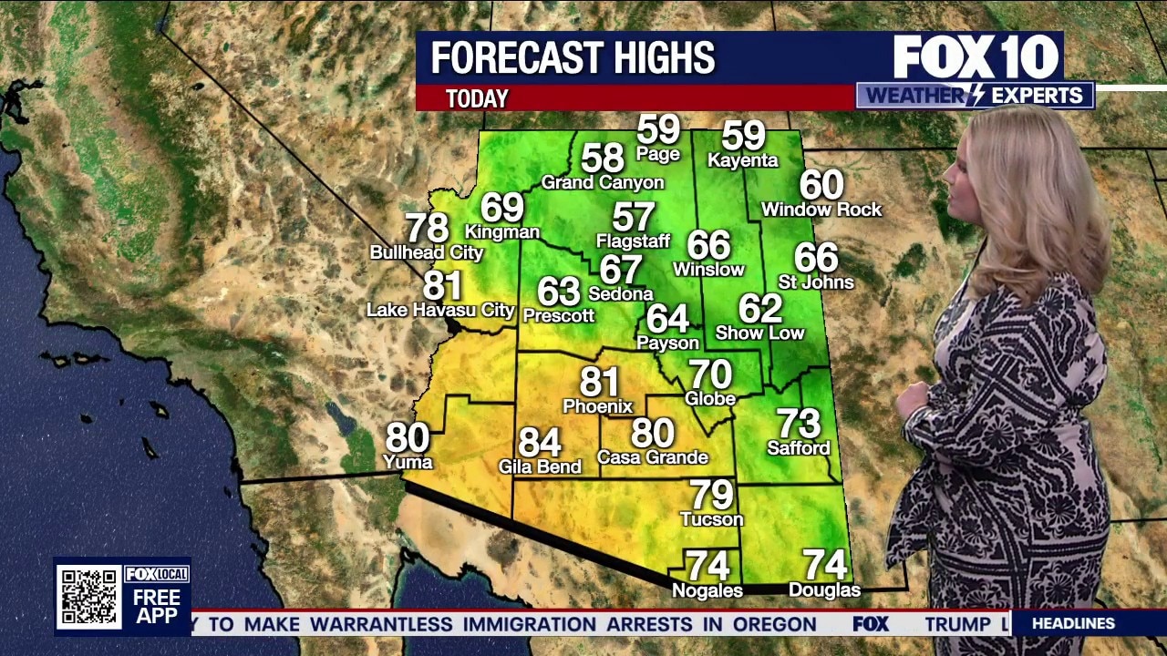 On Friday, the forecast high climbs to 81 degrees in the Valley. It will be partly sunny and dry. There is a low chance of an isolated shower or area of sprinkles in northern/eastern Arizona through this afternoon.