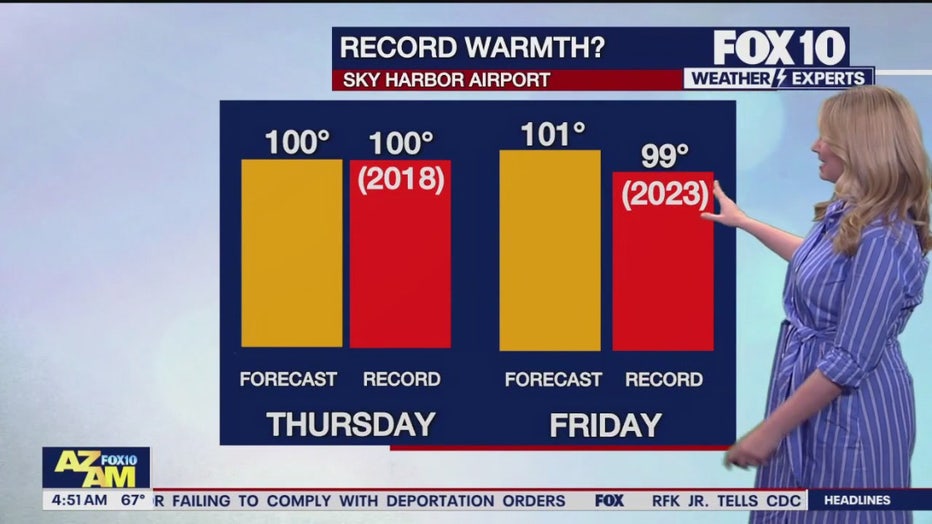 Friday may break a record, too. The forecast high is 101 degrees, and the current record is 99 degrees, set in 2023. Saturday is expected to hit 100 degrees, and the current record is also 99 degrees.